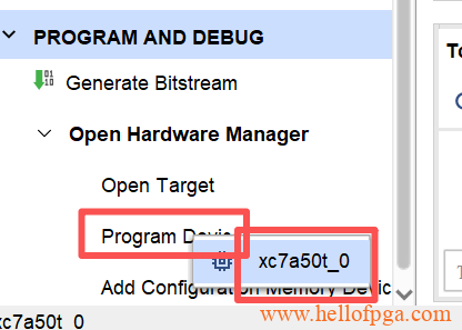 1) 点选 Program Device 然后选择芯片xc7a50t