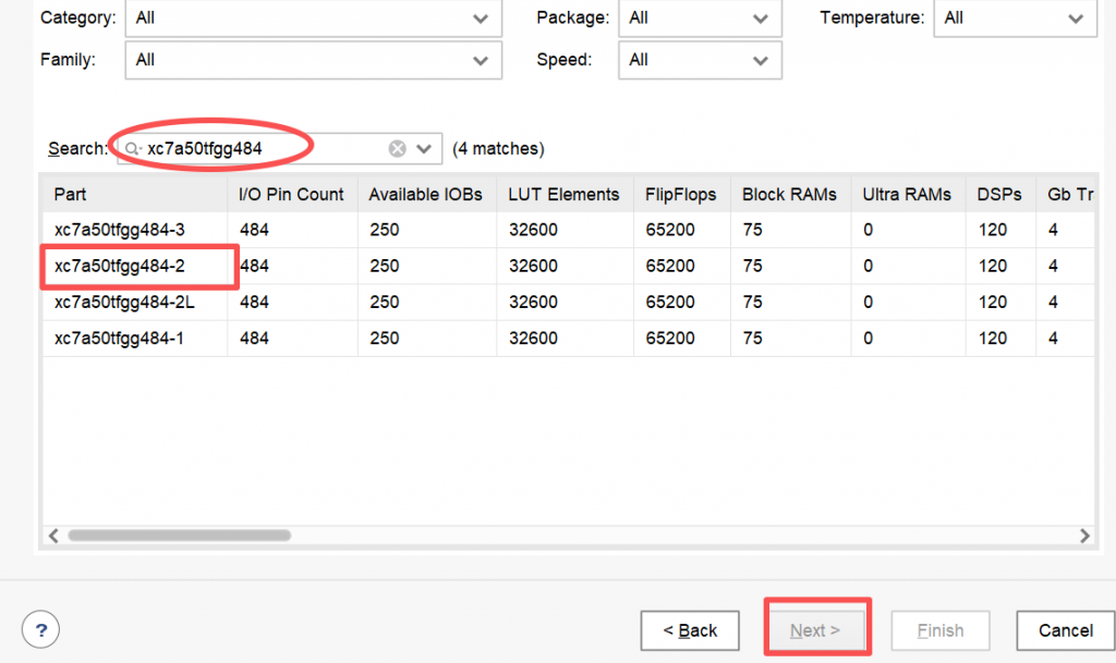 6)选择芯片型号  板子的芯片型号为 XC7A50T 封装是FGG484 所以型号我们选择 XC7A50TFGG484-2