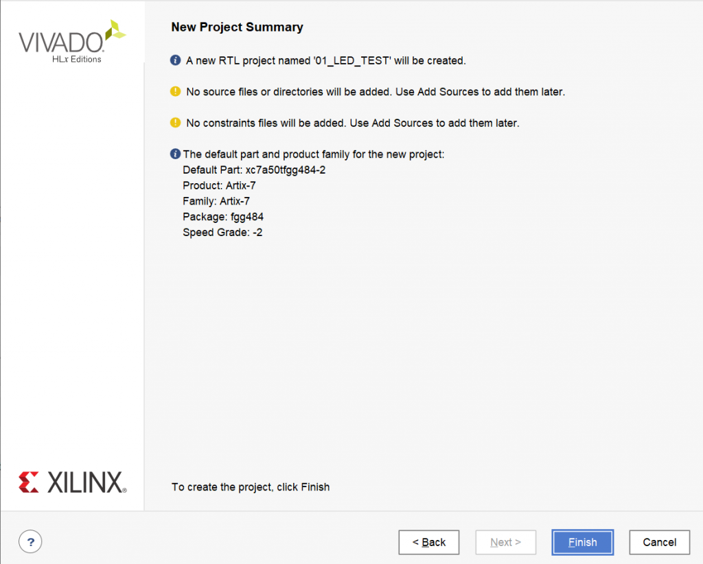 7)确认所选信息 点击“Finish”,完成vivado的工程创建