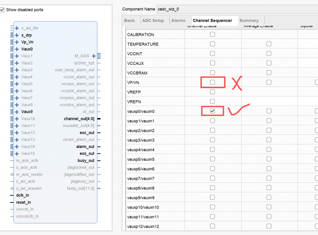 5. 实验中 我们选AD0来作为测试的引脚(没特殊原因,因为AD0在排针上最容易找),所以这里选择vauxp0/vauxn0 ,这里去掉VP/VN ,否则采样频率会降低一半
