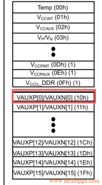 如何确定 具体的通道对应哪个地址呢,可以参考下图,比方说 Temp 就是 地址00h ,如果是Vccint 就是01h ,我们是Vauxp[0]按照图片推断,通道0应该是 10h