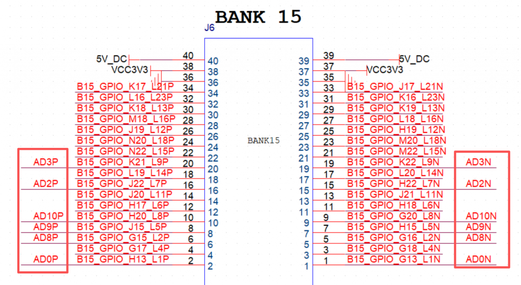 其中红圈框选出来的地方就是对应芯片外部管脚,不作为XADC 引脚的时候,可以作为普通IO口使用